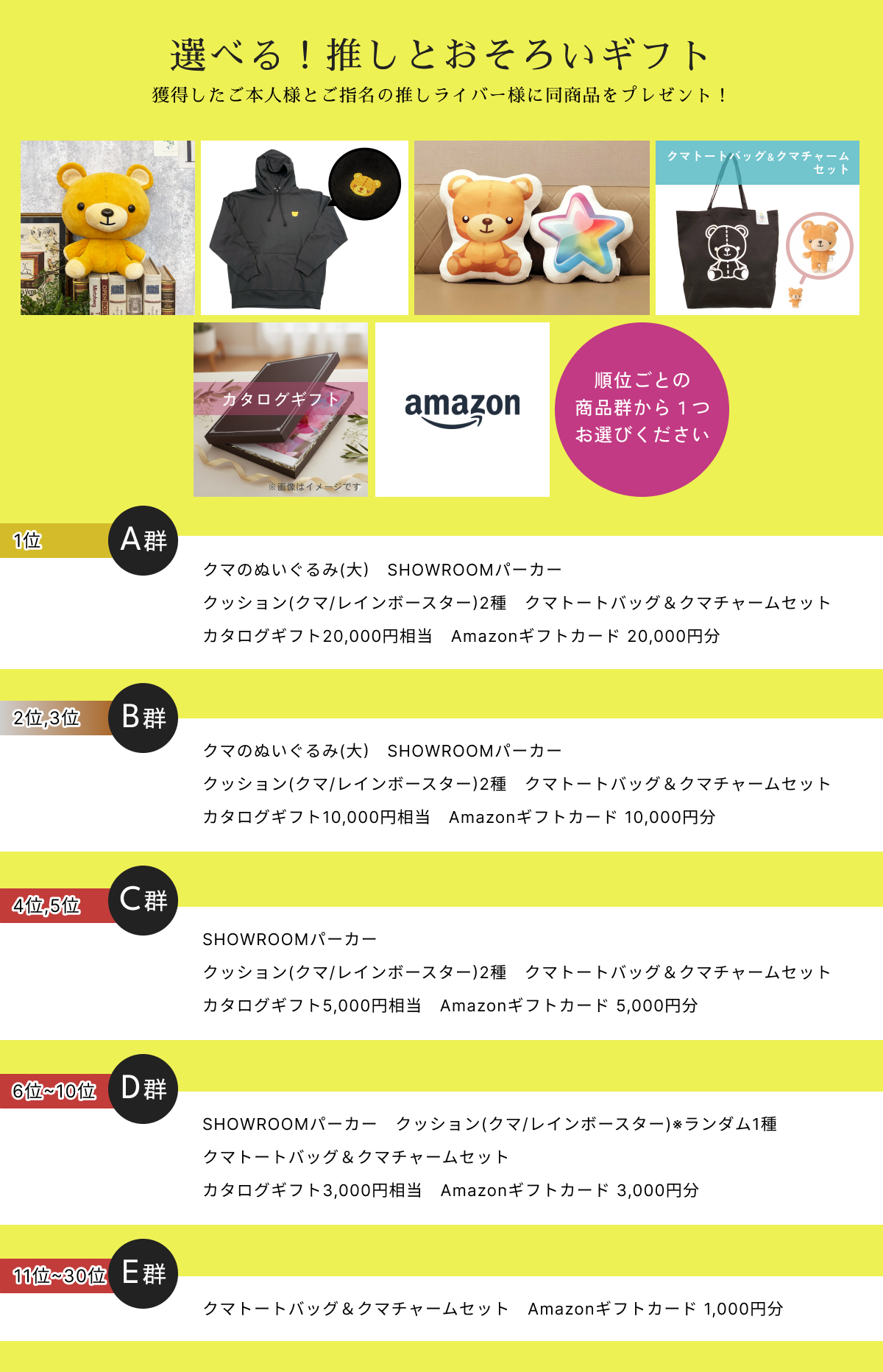 ①上位入賞者が各順位ごとの商品群から1つ特典を選択する